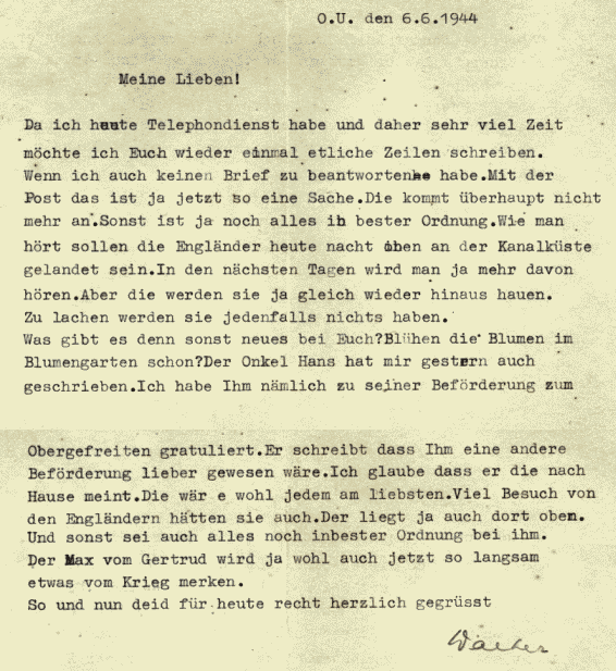 Wie man hört, sollen die Engländer heute nacht oben an der Kanalküste gelandet sein. In den nächsten Tagen wird man ja mehr davon hören. Aber die werden sie ja gleich wieder hinaus hauen. Zu lachen werden sie jedenfalls nichts haben.