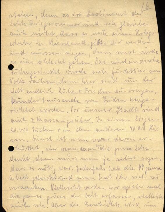 Soeben kam Dein Brief vom 5. 5. an und ich will auch sogleich antworten. Die Post arbeitet jetzt scheinbar etwas unregelmäßiger. Z.Z. habe ich die in Saarbrücken an 1 Tage abgeschickten Päckchen mit 80 gr Abstand bekommen. Gestern kam der Rest: Schokolade, Drops und Pudding mit Sacharin. Prima. Habe mich sehr darüber gefreut, denn süße Sachen sind hier Raritäten. Dagegen habe ich von Onkel Alex nichts bekommen. Papa hatte mir vor Wochen den Eingang meiner Reismarken (es war übrigens mein Restbestand) bestätigt, geschickt haben sie aber nichts (außer dem Speck). Aber ich will die Hoffnung nicht aufgeben, vielleicht kommen doch noch mal ein paar Kekse. Im Augenblick ist das aber nicht mehr so wichtig, denn ich hatte in den letzten 10 - 14 Tagen ausreichend zu essen. D.h. an der Truppenverpflegung hat sich nichts geändert, ich habe mir aber Zusatzverpflegung beschafft, die hauptsächlich aus Eiern + Kartoffeln bestand und mengenmäßig so viel war, wie die Truppenverpflegung und qualitätsmäßig sicher noch besser. Auch 1 Brot + ca. 180 gr Speck waren dabei. Wenn es so weiter geht und alles klappt, bin ich für die nächsten 2 - 4 Wochen auch noch versorgt und brauche nicht mehr hungern. Allerdings habe ich das Rauchen radikal eingeschränkt. Fällt zwar schwer, muss aber sein, denn es ist die Grundlage meiner Geschäfte, die ich raffiniert + rücksichtslos betreiben muss, um dabei zurecht zu kommen. Ich habe mich eben so langsam akklimatisiert und begriffen, dass man in Russland brutal und gewissenlos sein muss. Sonst geht man unter. [z.] [B.] Mein Tagesquantum Eier ist 4 - 12 Stück. Habe noch nie so viel Eier gegessen + werde sie wohl bald über haben. Nun zu Deinem Brief: Für die geographischen Auskünfte schönen Dank. Ist für mich sehr interessant. - Z.T. sind ja Deine Fragen schon durch vorangegangene Briefe beantwortet. Hast Du alle bekommen? Die letzten waren vom 2.5.10.15./V. Es wäre gut, wenn Du Deine Briefe nummerierst, damit ich danach den Eingang bestätigen kann. - Honig gibt es hier noch nicht. Wird auch sehr teuer werden, da Süßigkeiten + Zucker etc. fast gar nicht zu haben bzw. von den Russen selbst gegessen werden. - Für das Geld kannst Du Stoff besorgen. Du wirst aber wenig Glück haben, fürchte ich. Auch in Frankreich, denn da gibt es auch nicht mehr viel. - Dass Ihr Euch mit Onkel Alex so gut steht, freut mich sehr und auch, dass er sich mit der neuen Situation so gut abfindet. Hat er was von Kettenbachs gesagt? Was sie so über uns reden etc.? Natürlich war das Bild richtig geknifft. Scheinbar hast du mich nicht ganz kapiert. Ich kann nicht immer so schreiben, wie ich möchte, aber jeder Satz ist überlegt und nur muss man immer zwischen Übersetzung und Ironie unterscheiden. - Das Wetter ist wundervoll. Richtig Sommer. Glühender Sonnenschein, dazwischen erfrischende Gewitter. Schon seit ca. 14 Tagen. Dazwischen war es auch schon wieder mal kälter und nass, wird aber jetzt wohl schön bleiben. - Pfingsten wird bei uns "gefeiert". Seit einiger Zeit wird dafür eingespart: 1. Verpflegung (Fett, Fleisch, Portionsalkohol [alle 14 Tage 1/8 l. Rum], Brot etc.). Schokolade. 2. Marketenderwaren (Zigaretten, Zigarren, Bohnen-Kaffee, Schnaps, Likör etc.). Zur Feier werden DRK Schwestern, Offiziere und Musiker eingeladen. Alle bekommen voraussichtlich warmes Essen, Kuchen, belegte Brote, Bohnenkaffee gratis. Dazu käuflich: Tabakwaren + Alkohol. Natürlich schneiden wir dabei schlecht ab, denn die Gäste bekommen ja auch von den uns zustehenden Sachen. Ob das aber viel ausmacht, ist bei dieser Art der Verteilung nun nicht zu kontrollieren, ist aber auch gleichgültig, denn schließlich ist es doch ein schöner Beweis der Kameradschaft zwischen DRK, den Vertretern anderer Einheiten und uns, wenn wir ohne zu fragen was wir einbüssen und trotz der knappen Zeit, Gäste einladen und bewirten. Bei anderen Einheiten gibt es solche Feste nicht, sondern da werden die Lebens- u. Genussmittel gleichmäßig und gerecht verteilt, aber schließlich sind ja solche Feste sehr schön und Kameradschaft geht dann über Gerechtigkeit. Zunächst bin ich allerdings durch die Vorbereitungen schwer getroffen, denn ich bin wieder zum Singen kommandiert worden, obgleich ich gar nicht singen kann. Die Proben sind nun täglich 17 Uhr, also in der Zeit, wo ich sonst im Soldatenheim esse oder organisiere. (Es ist übrigens meine wachfreie Zeit.). Der Verlust ist für mich ganz beträchtlich, denn gestern gab es viel Zigaretten, die mir etwa 15 Eier eingebracht hätten. Ja, Feste feiern + Kameradschaft kosten eben Opfer. - Bin übrigens wieder auf Wache und versuche meine Gedanken zu sammeln, während das Radio quäkt. Das Programm ist ja jetzt immer sehr lustig. Schon mehrmals habe ich heute meine Lieblingsmelodie gehört: "Der kleine Postillion" + "Es saßen einmal 4 Mädchen auf einer Bank". Eben wurde auch gespielt: "Es ist so schön Soldat zu sein" und das erinnert mich so an die Garnison. Oft hört man auch schöne deutsche Tanzmusik und es fällt einem immer schwer, nicht aufzuspringen und den Kasten kaputt zu schlagen. (Verflucht! Das konnte ich mich nicht verkneifen. Das musste mal gesagt werden!) Ja, ich könnte ja nun noch sehr viel schreiben, denn Stoff habe ich mehr als genug, aber die Zeit ist ja zu knapp und man wird blöde vom vielen Schreiben. Eins aber noch: Meinen Bericht über Russland und die Gegenüberstellungen vom nationalsozialistischen Deutschland + dem bolschewistischen Rußland wirst Du ja inzwischen bekommen haben. Ich will dazu nur noch bemerken, dass Du allen Zeitungsberichten über Russland vollen Glauben schenken kannst, wenn auch viel propagandistisch herausgestellt wird, Es ist wirklich furchtbar, nicht nur jetzt, sondern auch gewesen. Aus Berichten der Bevölkerung habe ich vieles entnehmen können, obgleich es nicht zu einem abgerundeten Bild reicht. Aber einheitlich wird ungefähr folgendes gesagt: Lebensmittel, Schokolade, Alkohol + sonstige Genu