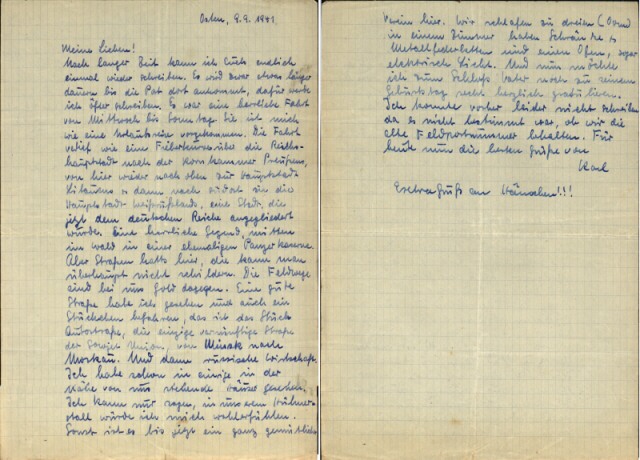 Und nun möchte ich zum Schluss Vater noch zu seinem Geburtstag gratulieren. Ich konnte vorher leider nicht schreiben, da es nicht bestimmt war, ob wir die alte Feldpostnummer behalten. Für heute nun die besten Grüße von