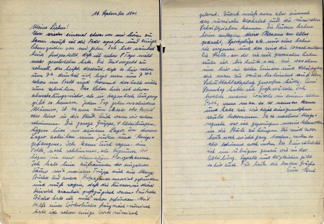 Die ganze Gruppe, 4 Abteilungen, liegt hier in einem Lager. In diesem Lager arbeiten nun Juden und Kriegsgefangene. Ich kann Euch sagen, ein Volk, noch schlimmer als Zigeuner.